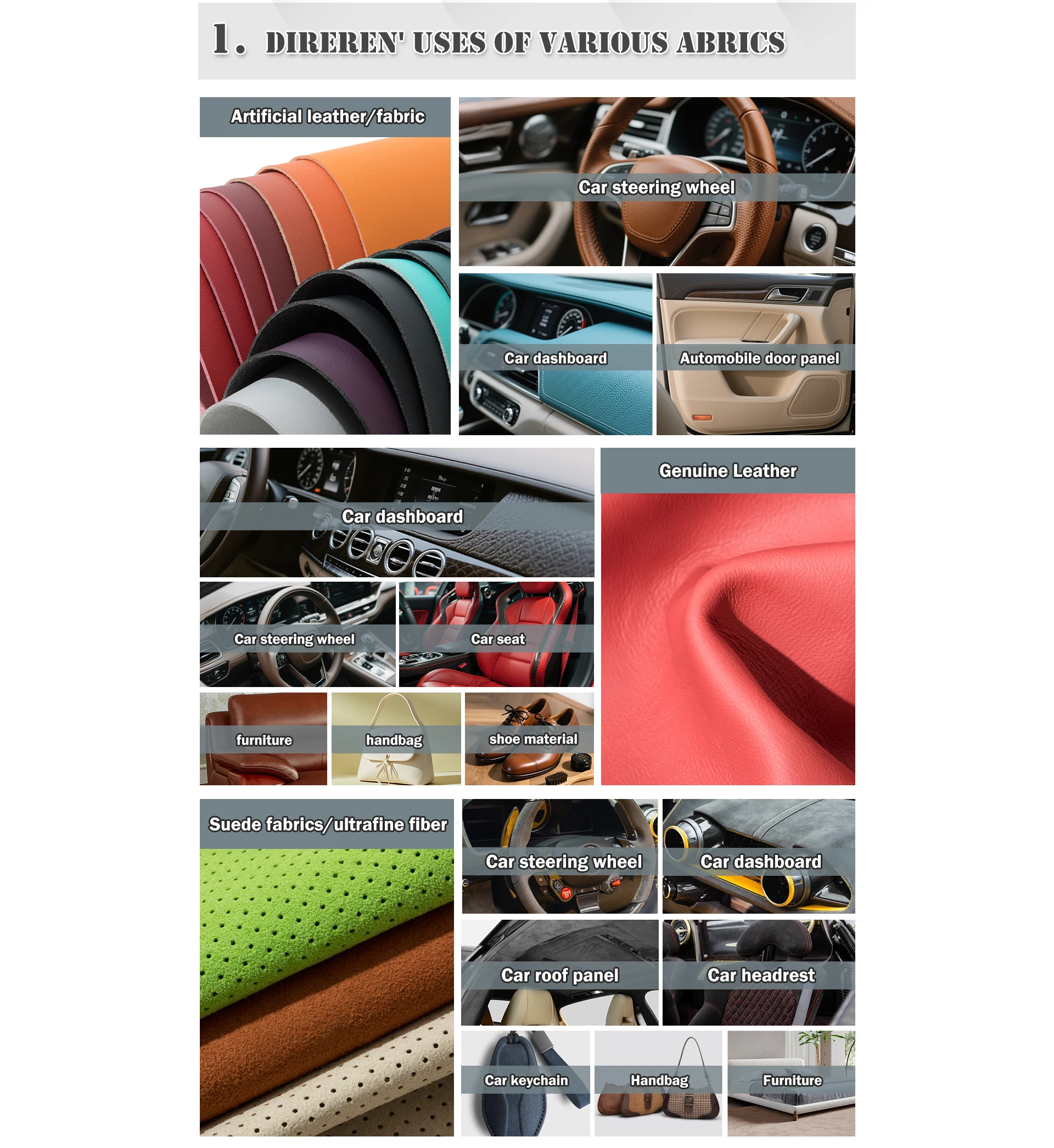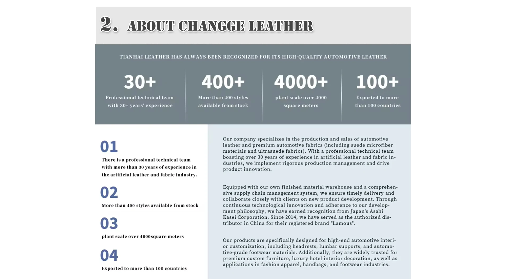 Основные продукты:Замша, синтетическая кожа, кожа из микрофибры, кожа ПВХ, искусственная кожа